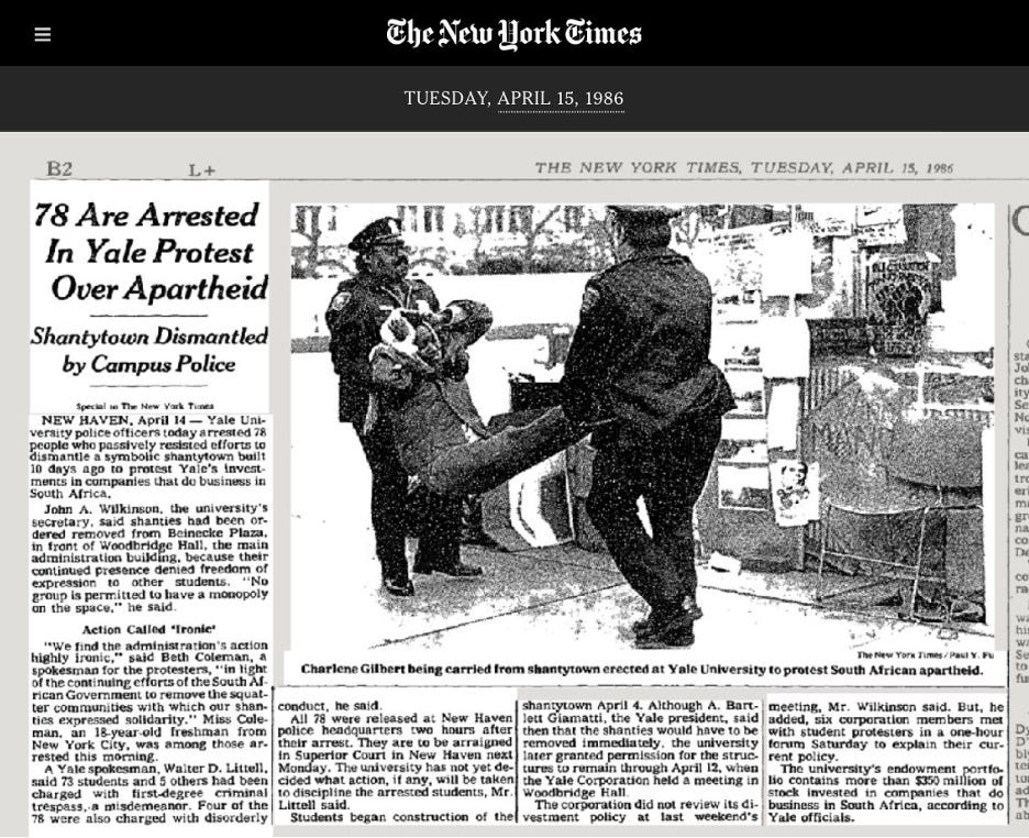 78 Are Arrested in Yale Protest Over Apartheid. The New York Times. 1986.