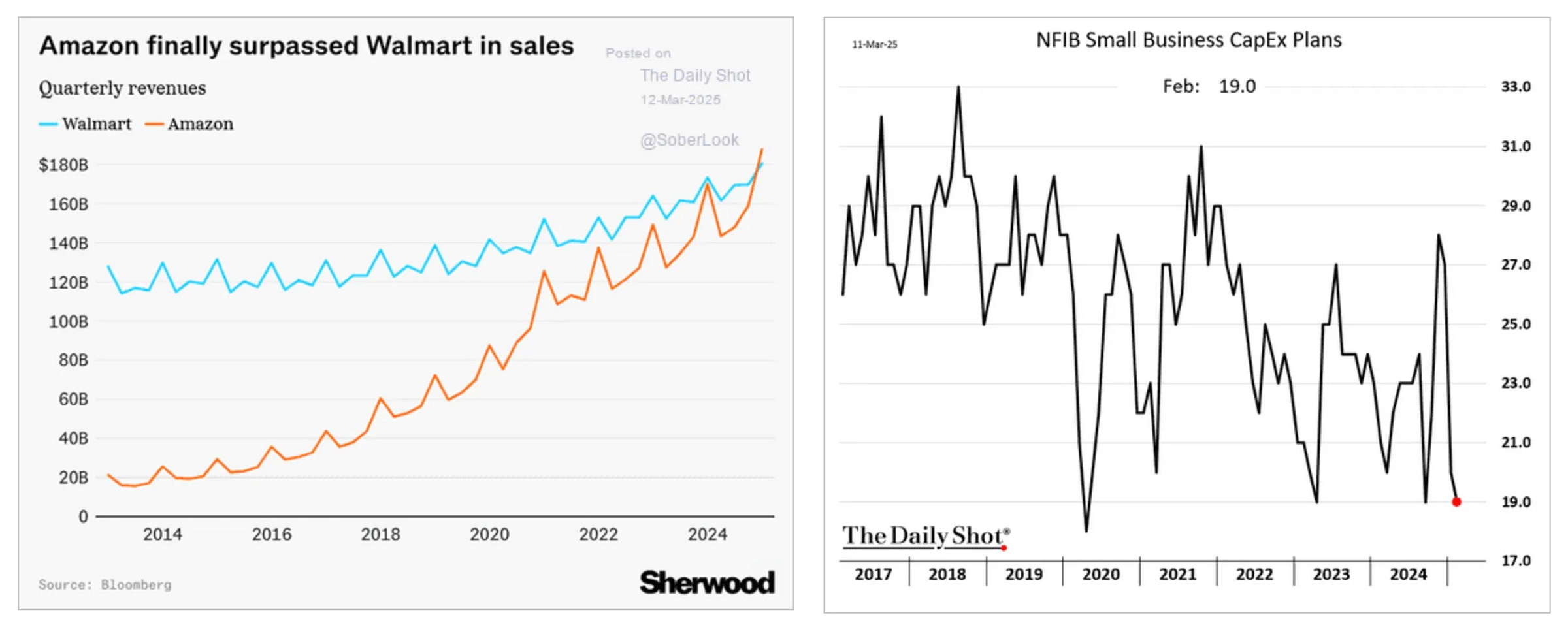 . One shows Amazon passing Walmart in quarterly sales for the first time. The other shows a steadily declining drop in plans for small business capital expenditure. Confidence shot up upon the election of Trump, but dropped suddenly when tariff talks trumped tax tempering. Together, these charts paint a picture: control over how people buy, build, and shape space is shifting — fast.It all starts quietly. A parking lot gets fenced off. Trucks show up. Maybe the old strip mall disappears overnight. A few months later, there’s a low, gray building with no windows. No grand opening. Just a stream of delivery vans pulling in and out.
