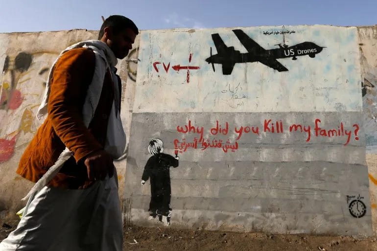 As my own kids were being born in 2004, U.S. drones were flying across the skies over Afghanistan, Yemen, and beyond, vaporizing wedding parties, schools, and outdoor markets, shredding innocent men, women, and children into mangled flesh mixed with bone fragments. These ‘Hellfire missiles’ were sold to the public as possessing surgical precision. These “precision” killings, justified as “targeted” under the euphemism of “signature strikes,” leave behind charred craters, orphaned survivors screaming amid the rubble, and “double taps” that slaughter first responders rushing to the scene. And here again the body-count calculus of modern warfare dehumanizes the dead as mere “collateral” in an endless cycle of remote-control atrocity.